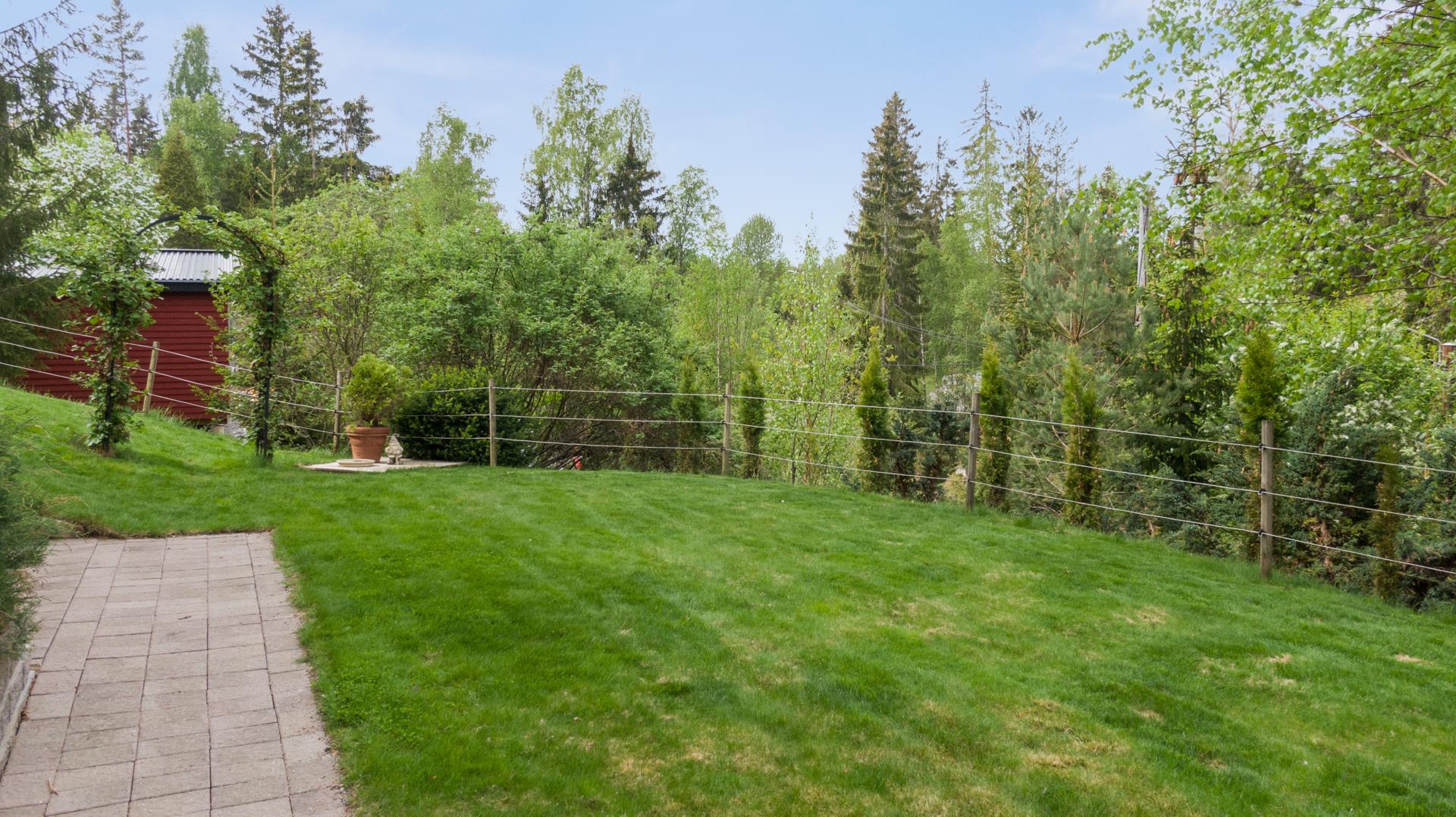 Kontakta mäklaren ifall du vill ha hjälp med att ta fram en boendekostnadskalkyl.Stor och generös tomt som ligger inbäddad i grönska och ger ett privat läge. På framsidan finns en stor grusad uppfart där flertalet bilar får plats och en trappa leder till entréplanet och en stenlagd gång leder till lägenheten på det nedre planet. På baksidan finns den stora altanen. Via några trappsteg och en liten gång nås gästhuset. Förrådet är smart placerat i ena änden av altanen. Tomten bjuder på massor av växtlighet där man själv kan bestämma hur mycket man vill göra. För den med gröna fingrar så finns gott om plats för odlingslådor och för de nyfikna barnen finns det fin skog bakom.