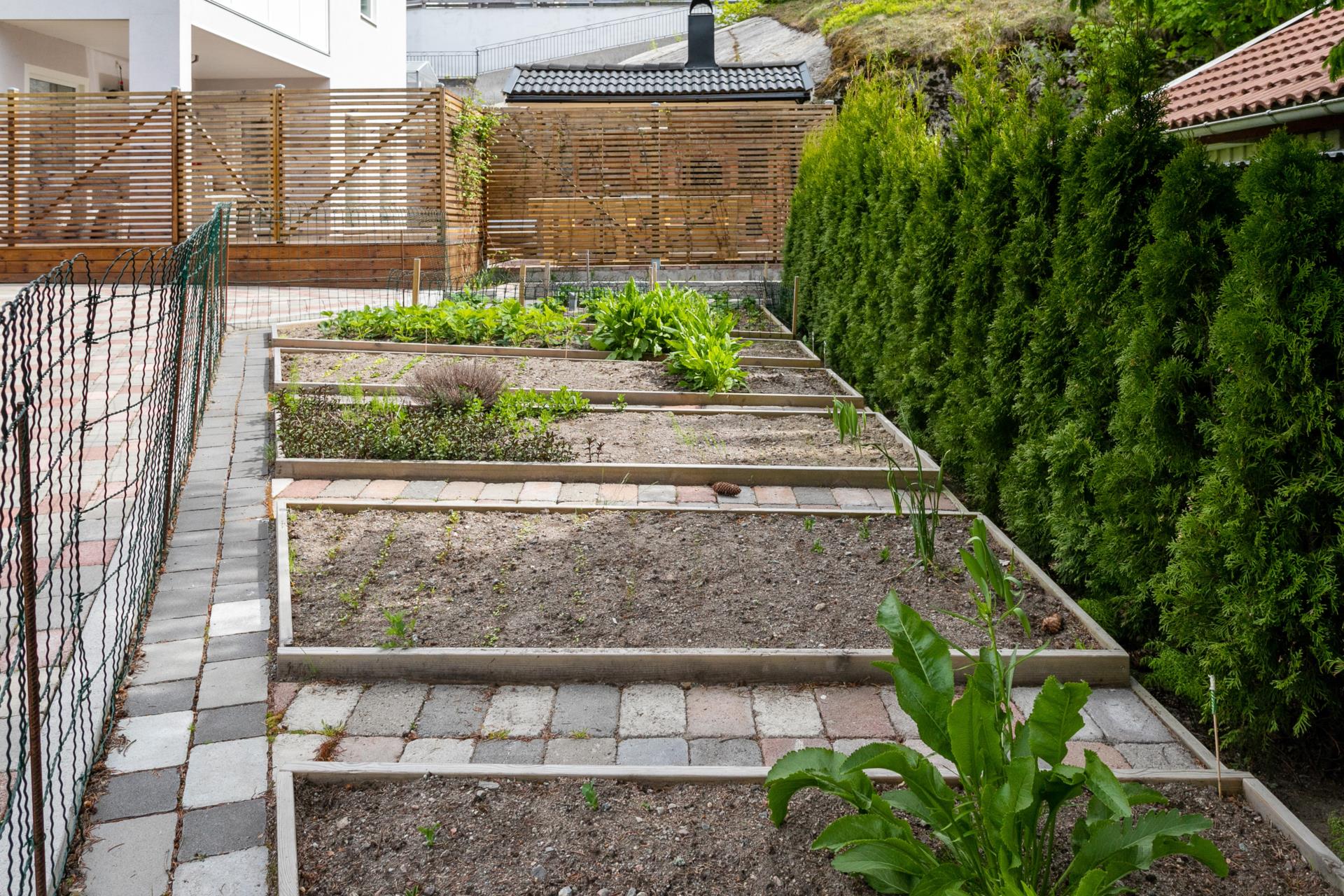 Tomten är välplanerad med en stor gräsmatta, stensättningar på väl valda delar, tujor runt stora delar av tomten och ett välplanerat trädgårdsland. I anslutning till altanen som sträcker sig runt villan finns ett växthus som nås via en trätrappa. Under växthuset, insprängt i berget finns ett förvaringsutrymme. Ett praktiskt vedförråd finns även i anslutning till altanen.