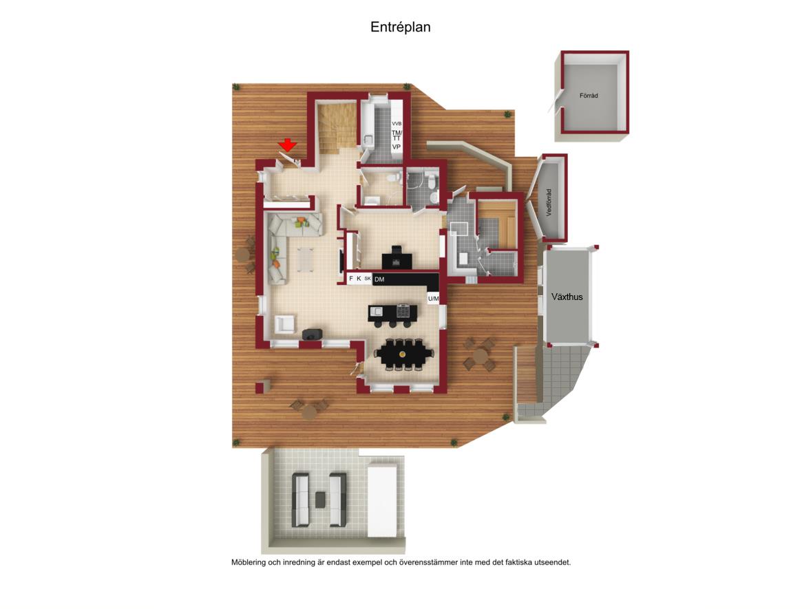 - Altan runt hela villan, växthus, utomhuskök med rökeri och vedspis, vedförråd och separat förrådsbyggnad.