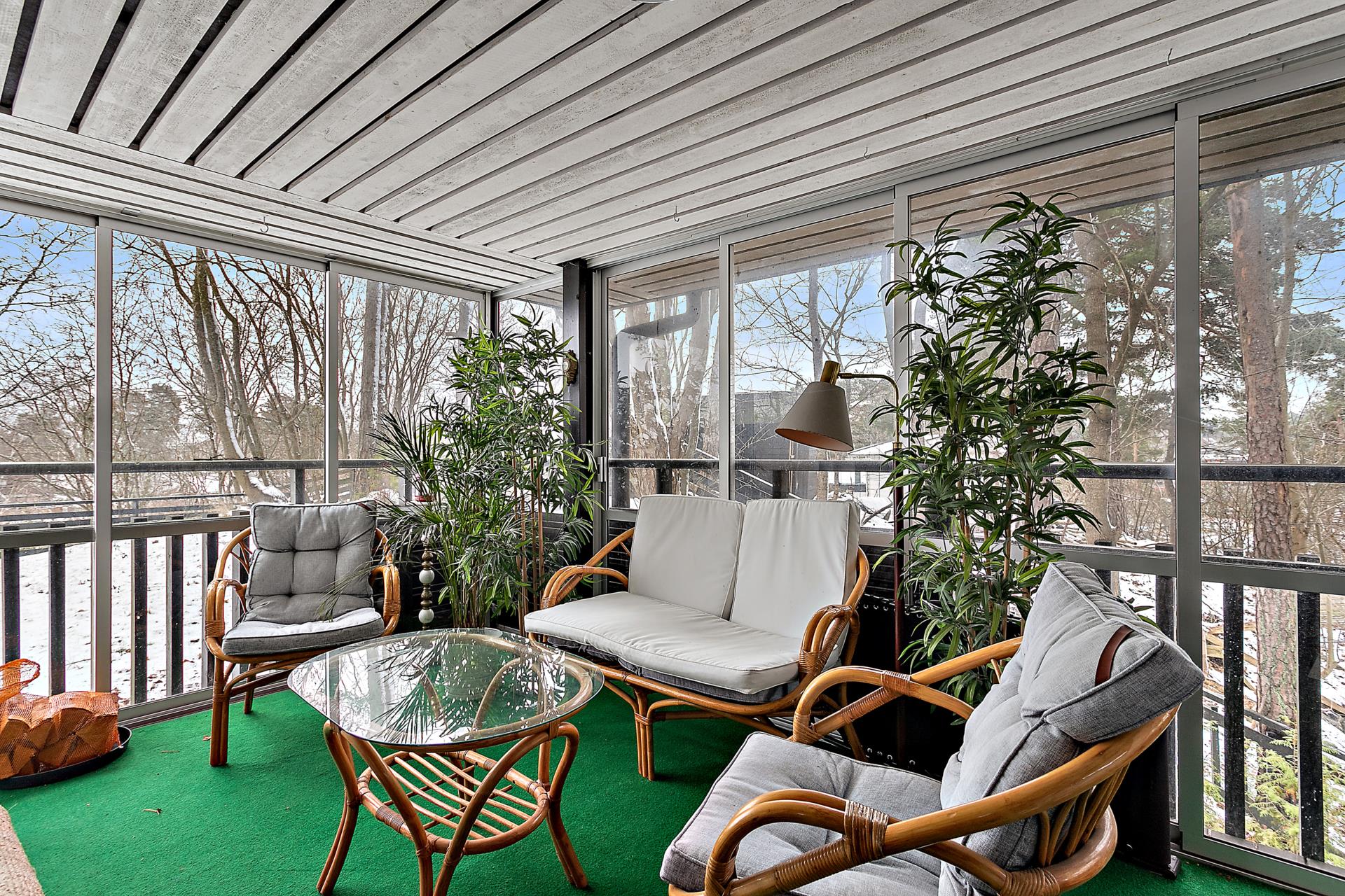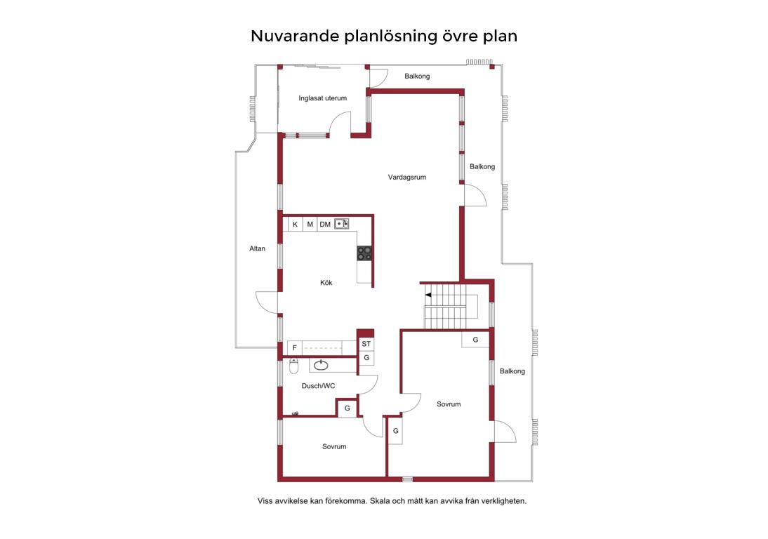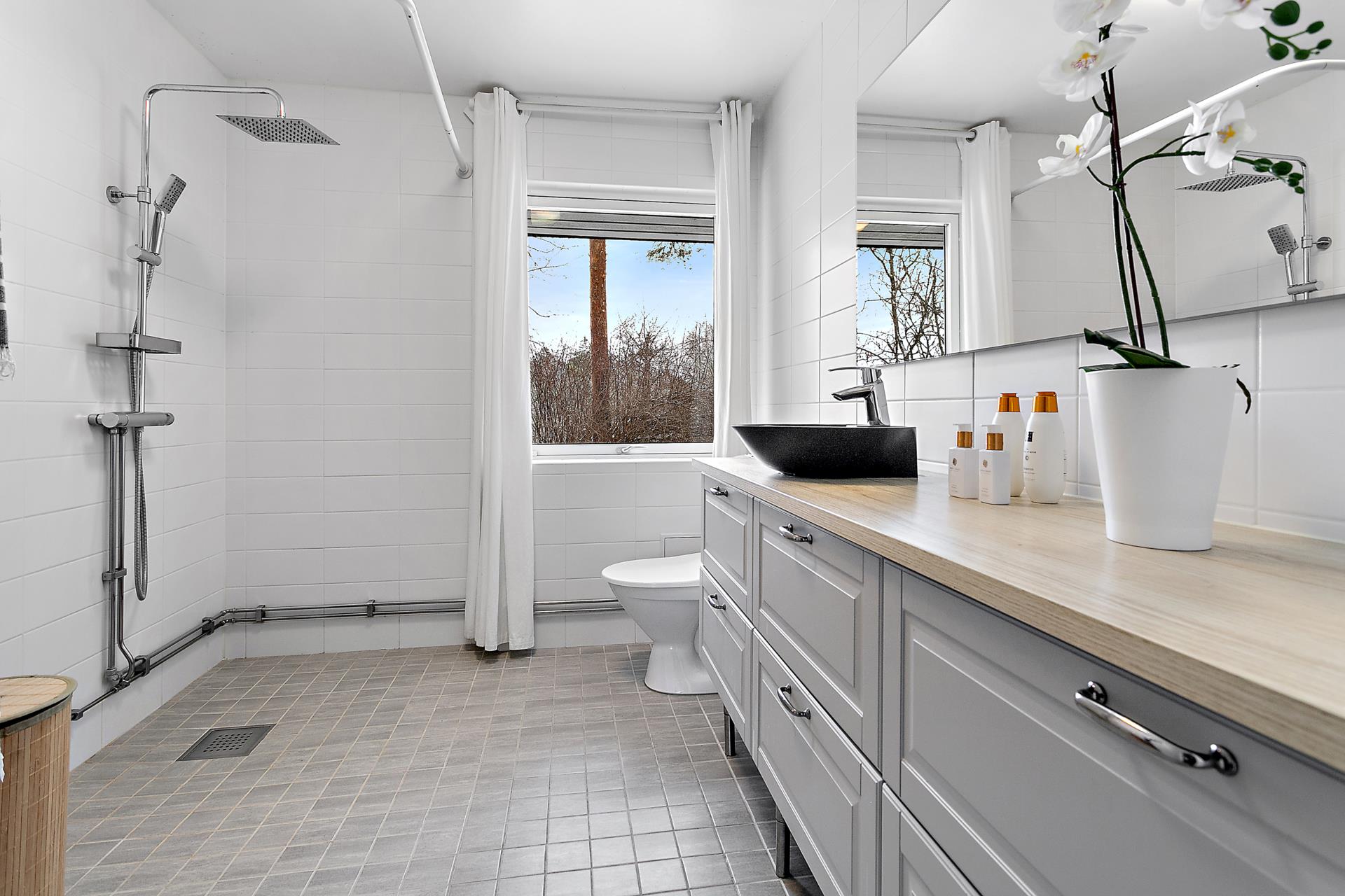 På övre plan finns ett väl tilltaget kök med generösa arbetsytor, matplats för 6-8 personer, utgång till altan och massor av förvaring. Vardagsrummet ligger direkt vid köket och här finns det plats för stora soffgrupper, matbordsgrupp samt mediamöbler. Dessutom nås den inglasade delen från vardagsrummet samt balkongen via två separata utgångar. På detta plan finns även två sovrum som lätt kan bli tre om man så vill samt helkaklad dusch/WC med takdusch som renoverades 2019. Ett av dessa sovrum har utgång till balkongdelen.