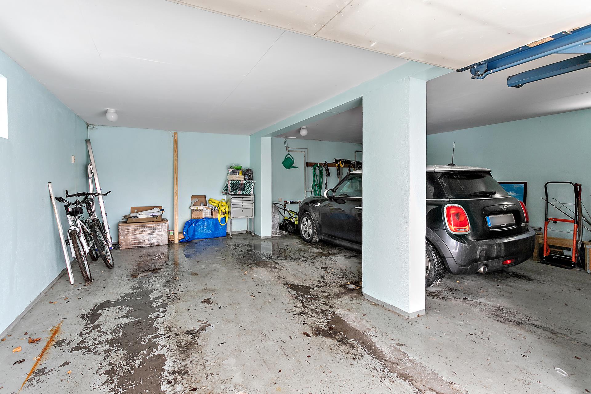 Garaget som är ca 40 m² har plats för två bilar. Här finns el, kall och varmvatten samt avlopp. Perfekt för hemmafixaren. En praktisk jordkällare skapar ytterligare förvaring.