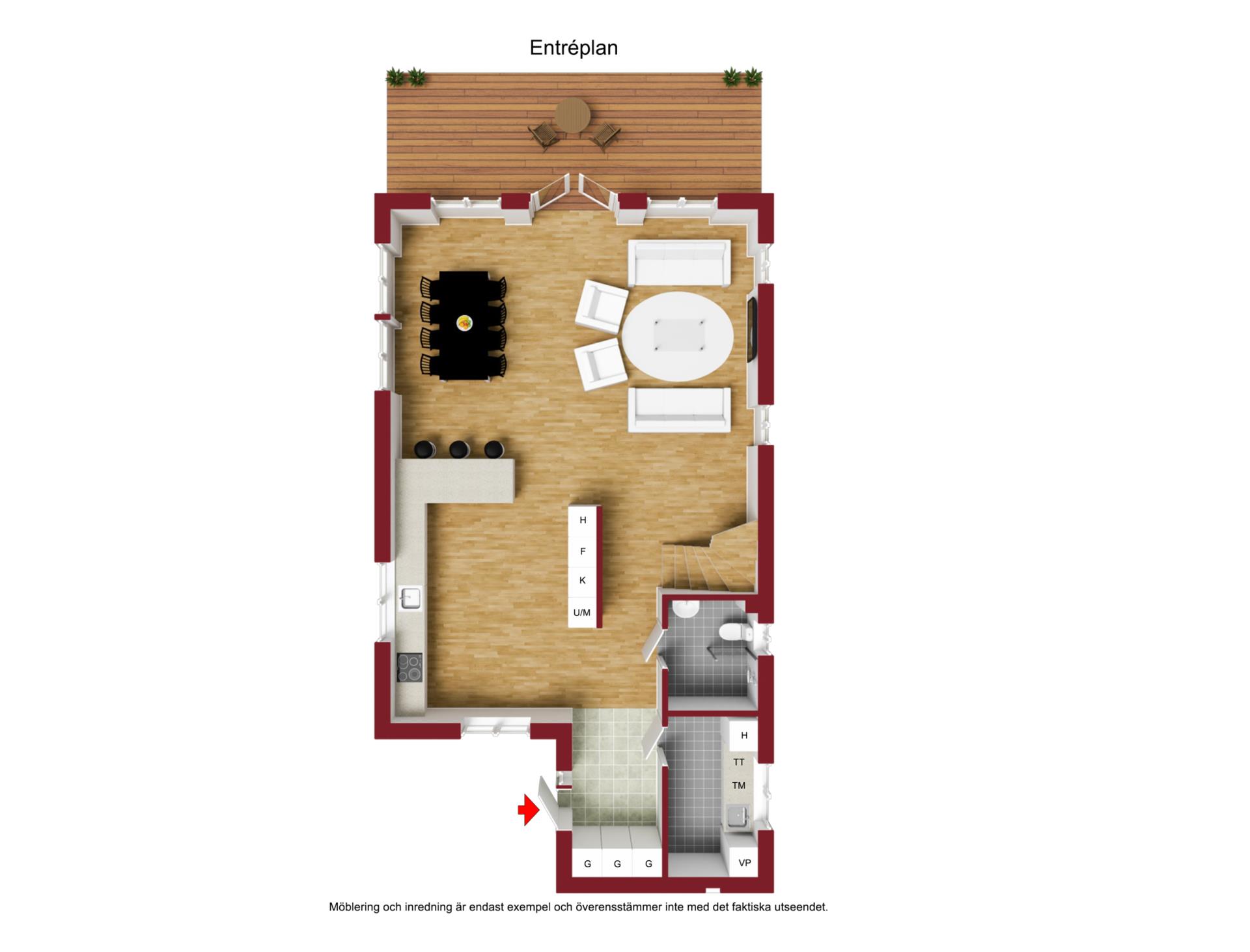 Övre planets utformning är väl genomtänkt med massor av olika möjligheter. I nuläget finns det 3 strategiskt avskilda sovrum där en god natts sömn garanteras inom ljusa och luftiga kvadratmeter. Allrummet är perfekt för barnen och deras kompisar att umgås i. Vill man ha ytterligare sovrum kan man lätt göra om allrummet till ett ytterligare sovrum. Dessutom finns det ett rum till som även kan att användas till en lyxig klädkammare eller arbetsrum/barnrum. En separat klädkammare finns dock redan.