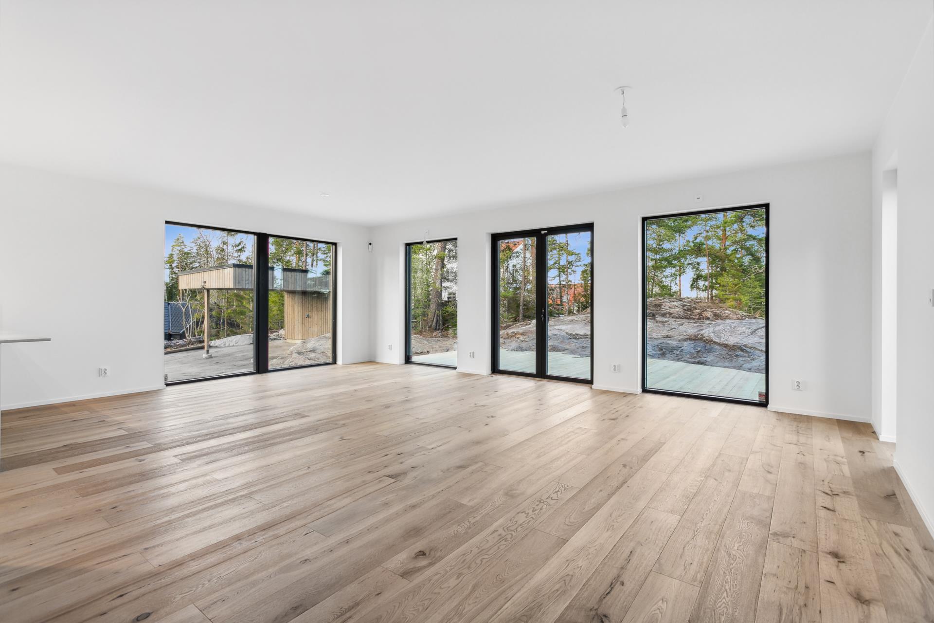 Det rejält tilltagna vardagsrummet ligger i en öppen planlösning mot köket med massor av härligt ljusinsläpp via stora fönsterpartier mot den grönskande baksidan. Vardagsrummet är rymliga 40 m² och här finns plats för stora möblemang som soffor, stort salongsbord/matbord, mediautrustning och annan önskad möblering efter egna behov. Möjligheter finns att skapa ett sovrum om ca 10-12 m² om man tycker att vardagsrummet är för stort. Via altandörren når man den fina altanen.