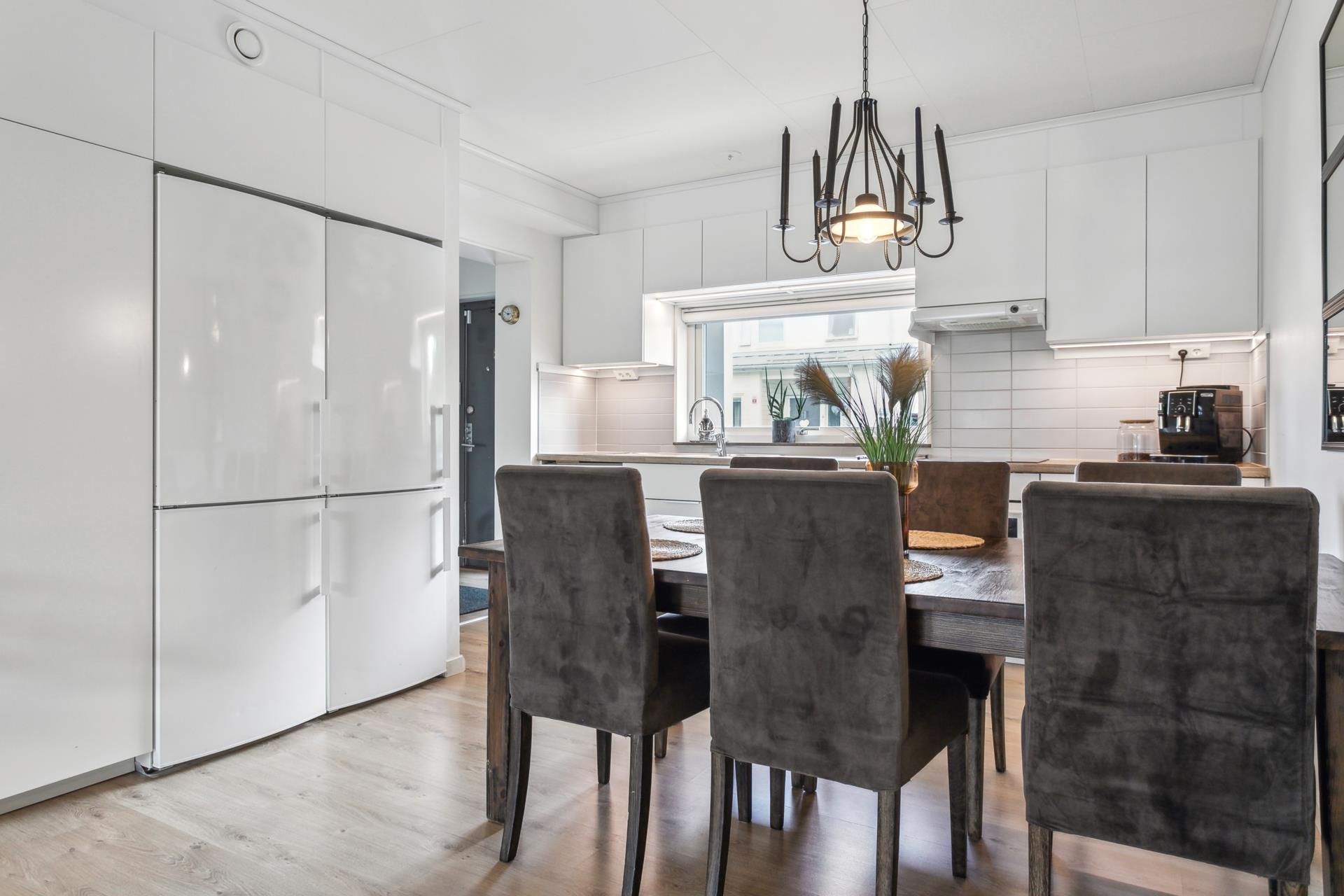 Köket har rejäl matplats, massor av bra förvaring och generösa arbetsytor. Vardagsrummet har gott om plats för stor soffgrupp samt mediamöbler och via en altandörr nås den stora altanen och tillhörande gräsyta med planteringar som skapar en väldigt trivsam radhuskänsla.