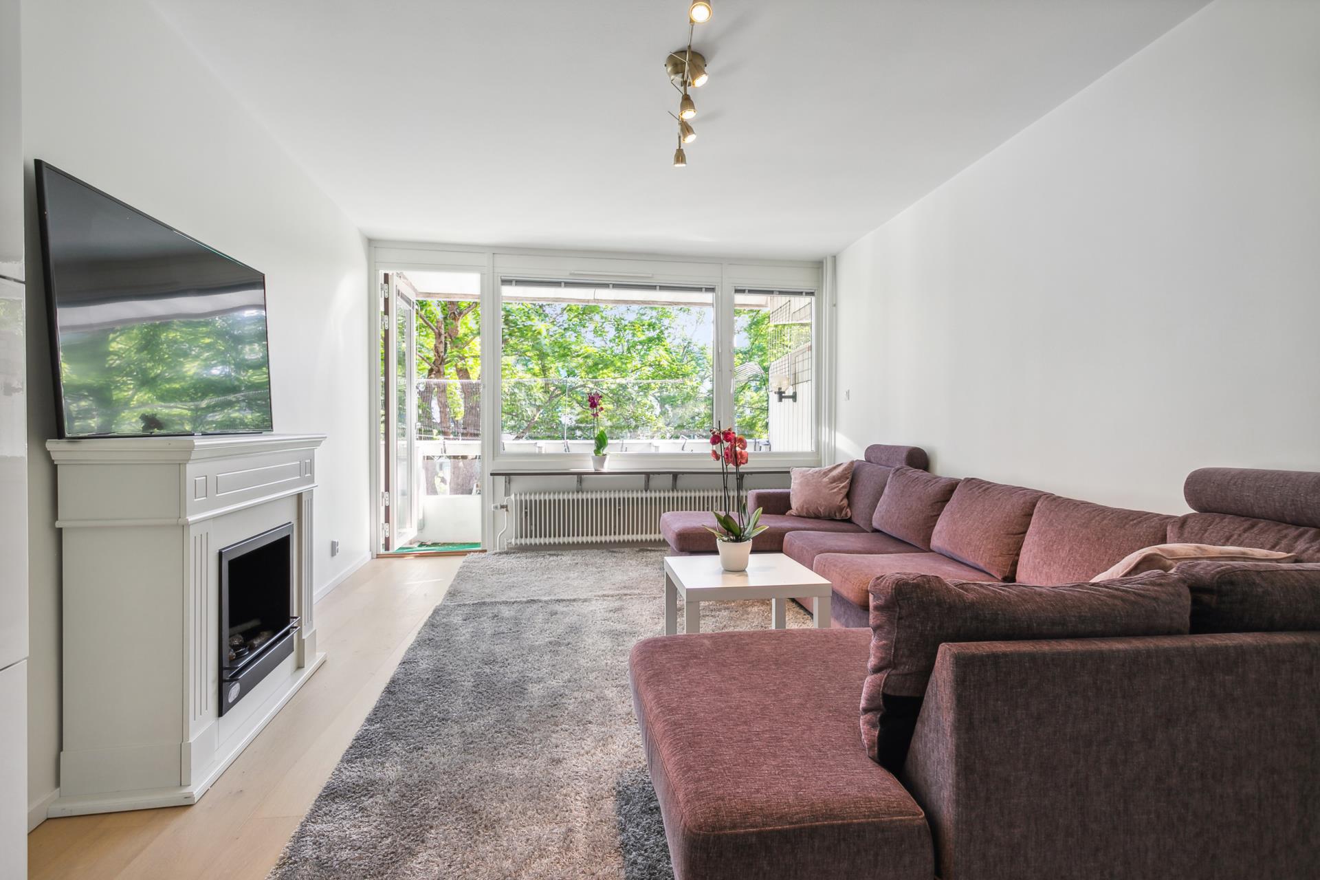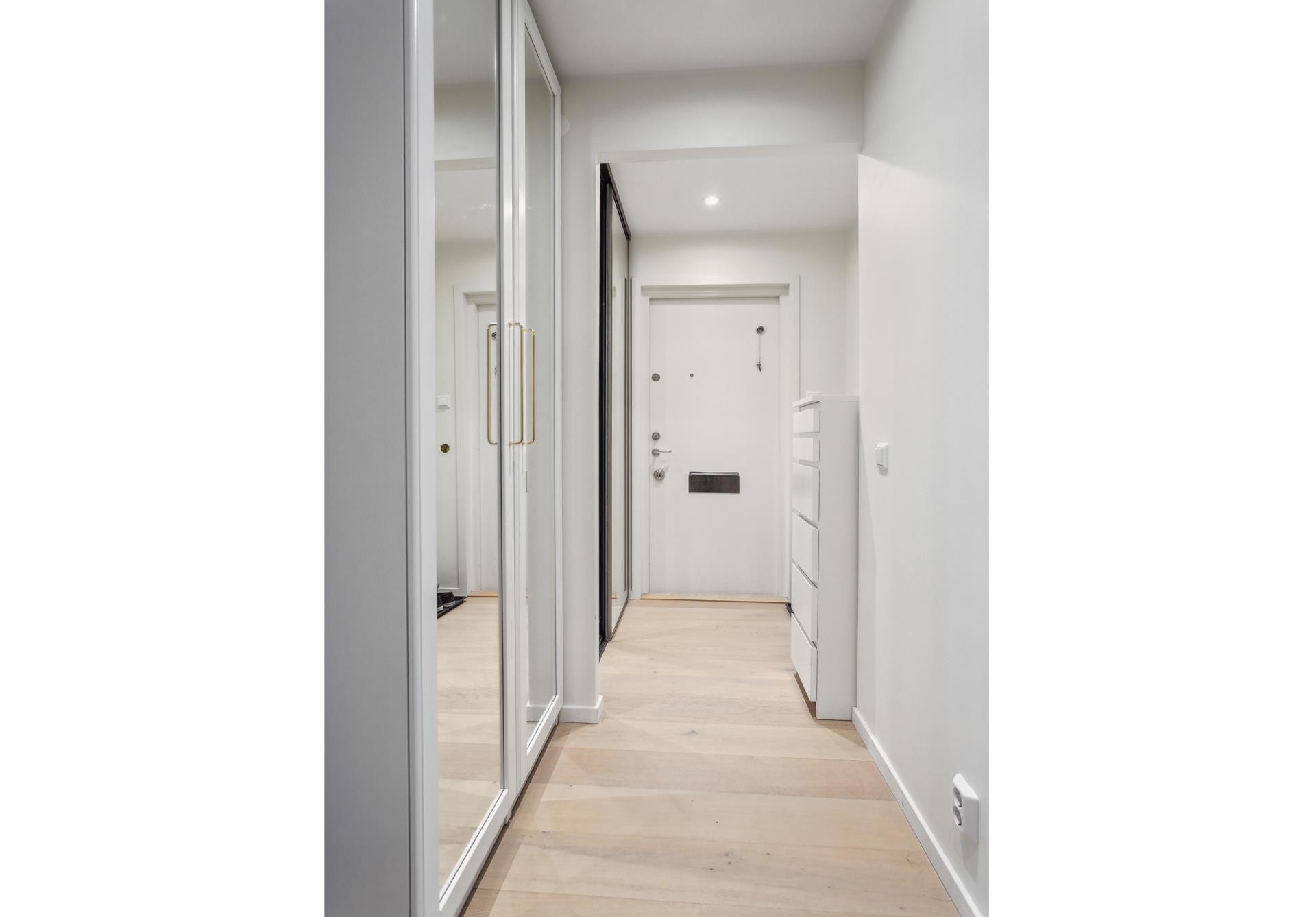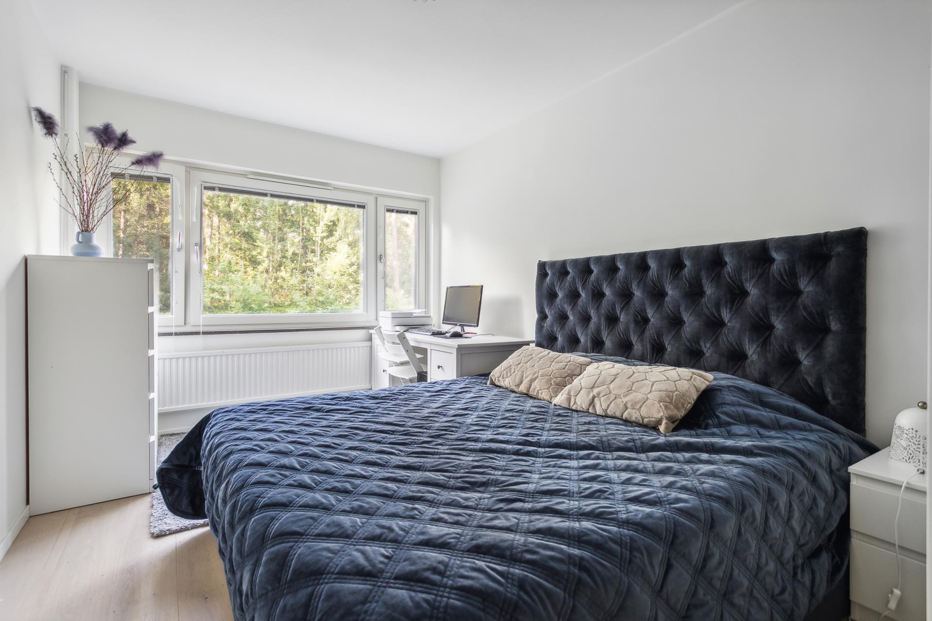Köket bjuder på massor av bra förvaring, generösa arbetsytor, rejäl matplats intill fönster mot grönska utanför och moderna vitvaror. Mitt emot köket ligger vardagsrummet som lätt rymmer stor soffgrupp och mediamöbler. Via balkongdörren når man den stora balkongen i soligt söderläge som också nås från ena sovrummet. Det andra sovrummet vetter mot den lummiga framsidan och är också vältilltaget. Den inre hallen har access till en separat klädkammare samt ett påkostat badrum (totalrenoverades 2023) med vägghängd WC och badkar. Förberett för både tvättmaskin och torktumlare ifall man inte orkar nyttja föreningens tvättstuga. Hall/entré har praktisk förvaring bakom två skjutdörrar och vitlaserat enstavigt ekparkettgolv sträcker sig in i lägenheten förutom i köket som har klassiskt mattlackad ekparkett.