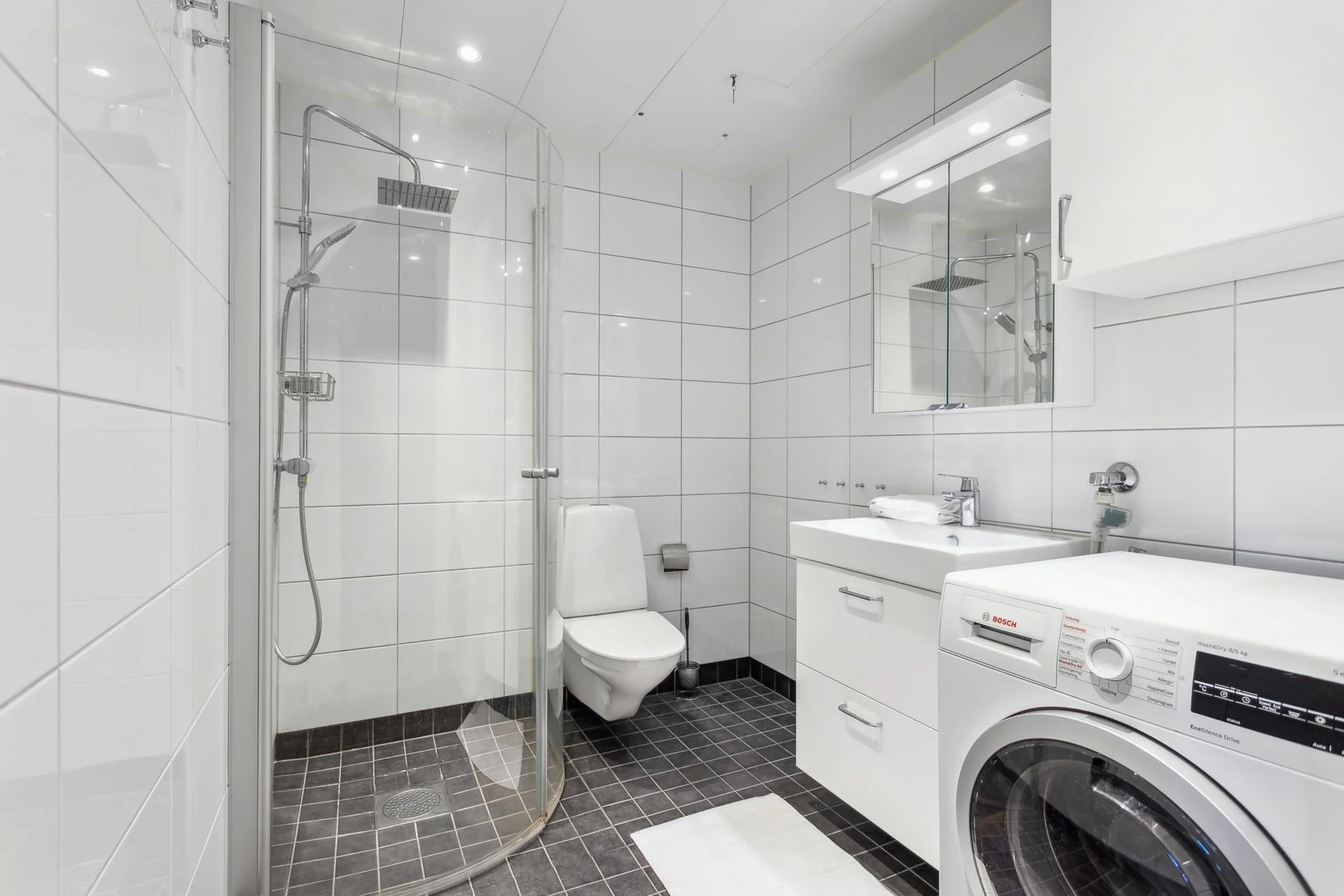 Stilren dusch/WC med helkaklade väggar och klinkergolv som har golvvärme. Duschhörna bakom två svängbara glasdörrar, tvättmaskin som har inbyggd torktumlare, vägghängd WC, badrumsskåp och väggskåp. Spotlights i tak bidrar med bra belysning.