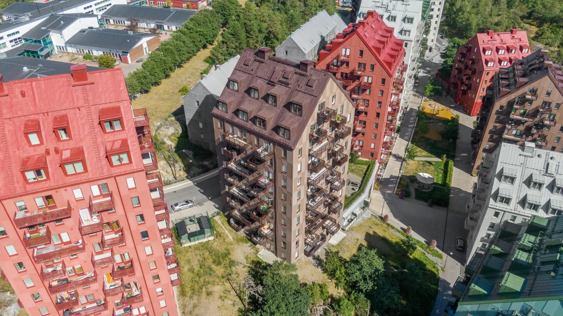 Kommunikationer | Inom bekvämt promenadavstånd om ca 5 minuter når man Albys tunnelbanestation där röda linjen går mot bl.a. Skärholmen, Liljeholmen, Slussen och T-centralen med täta avgångar. Till slussen och Stockholms C tar det ca 30 minuter. Invid tunnelbanan avgår också flertalet busslinjer mot bl.a. Hallunda, Tumba, Salem och Rönninge med flertalet anslutningar på vägen till olika kommundelar. Vill man ta bilen en bit för att sedan åka med SL-trafiken finns bra med pendelparkeringar i anslutning till Tumba station, ca 10 minuter bort från bostaden med bil. För den bilburne når man smidigt E4:an efter bara några minuter.